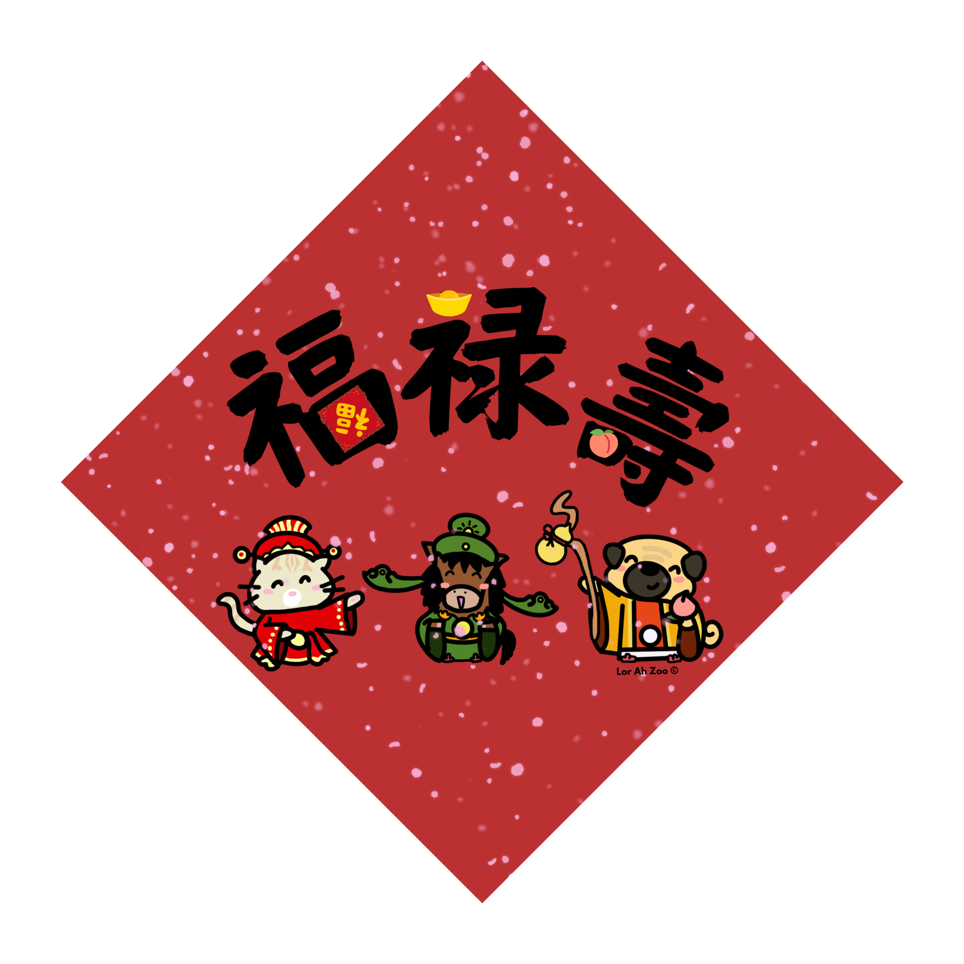 福禄壽 represents the complete package: Luck, Prosperity, and Longevity. Traditionally, these are represented by three wise old men. In our version, we’ve replaced them with the real masters of the good life—our pets.